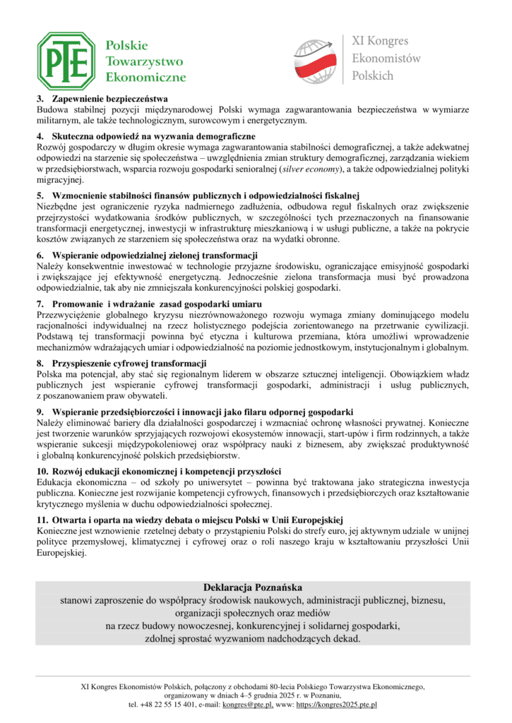 W dniach 4-5 grudnia w Poznaniu odbył się XI Kongres Ekonomistów Polskich, połączony z obchodami jubileuszu 80-lecia Polskiego Towarzystwa Ekonomicznego. Krajowe Centrum Edukacji Ekonomicznej było partnerem wydarzenia. Wybitni eksperci, praktycy, przedstawiciele świata nauki, biznesu i administracji publicznej debatowali nad kluczowymi wyzwaniami, które stoją przed współczesną gospodarką. Na zakończenie wydarzenia przyjęto „Deklarację Poznańską” – zestaw kluczowych postulatów, które stanowią propozycję kierunków działań dla decydentów, środowisk akademickich i gospodarczych, które mają przyczynić się m.in. do zwiększenia odporności polskiej gospodarki.